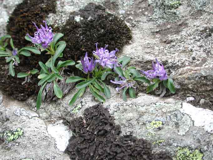 Famiglia: Campanulacee Nome volgare: Caratteristiche: Fusto ridotto; foglie basali spatolate, spesso canalicolate; capolino violetto subsferico. | ||